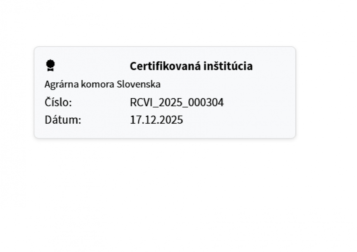 Agrárna komora Slovenska bola dňom 17.12.2025 zapísaná do registra certifikovaných vzdelávacích inštitúcií, ktorý vedie a spravuje Ministerstvo školstva, výskumu, vývoja a mládeže SR (ďalej iba „ministerstvo školstva“) v Informačnom systéme vzdelávania dospelých: https://isvd.iedu.sk/ViewCertifiedEducationalInstitutionsRegistry