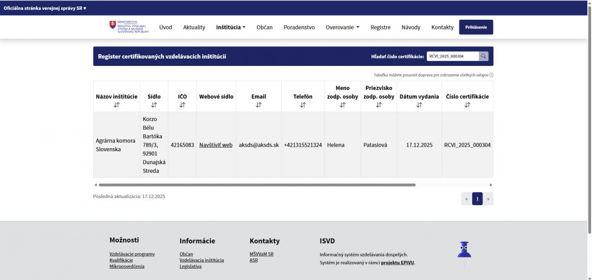 Agrárna komora Slovenska bola dňom 17.12.2025 zapísaná do registra certifikovaných vzdelávacích inštitúcií, ktorý vedie a spravuje Ministerstvo školstva, výskumu, vývoja a mládeže SR (ďalej iba „ministerstvo školstva“) v Informačnom systéme vzdelávania dospelých: https://isvd.iedu.sk/ViewCertifiedEducationalInstitutionsRegistry