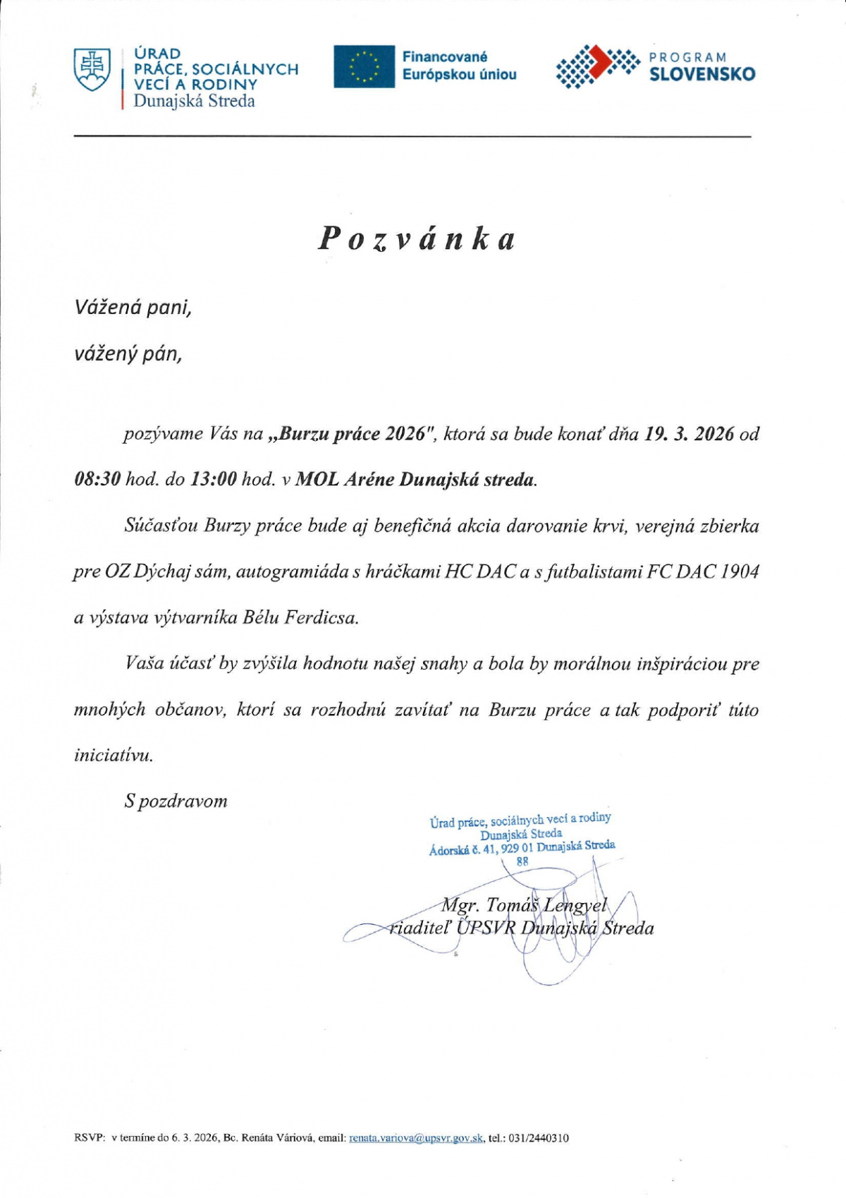 Úrad práce, sociálnych vecí a rodiny pozýva Vás na "Burzu práce 2026", ktorá sa koná dňa 19.3.2026 od 8:30 hod. do 13:00 hod. v MOL Aréne Dunajská Streda.