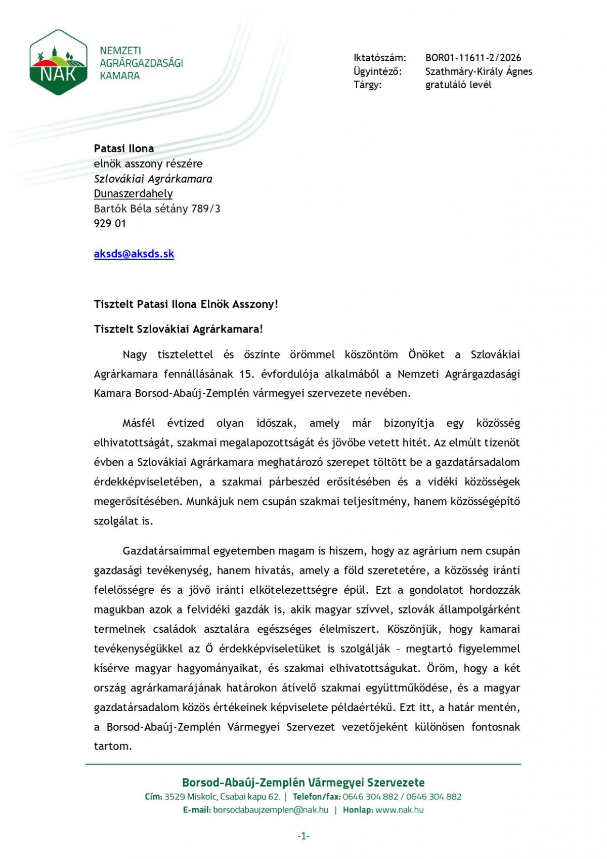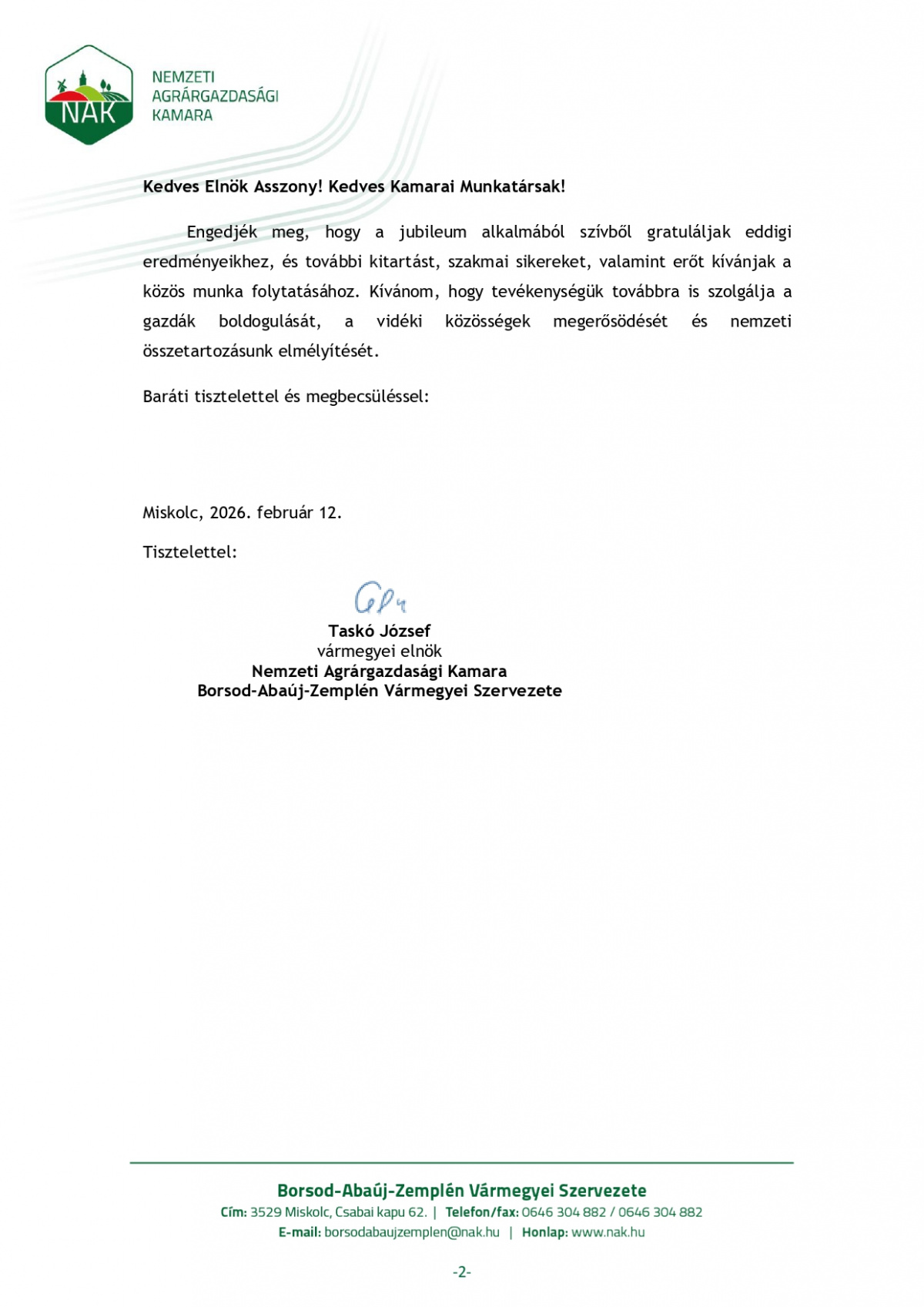 Nemzeti Agrárgazdasági Kamara gratuláló levele