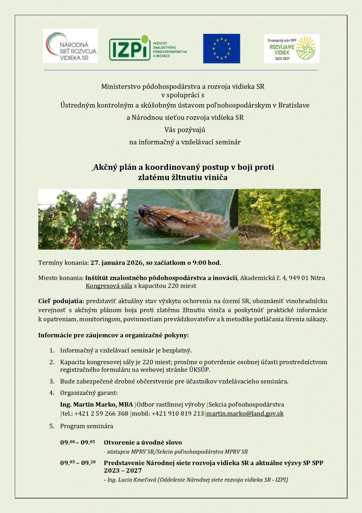 Dovoľujeme si Vás pozvať na informačný a vzdelávací seminár „Akčný plán a koordinovaný postup v boji proti zlatému žltnutiu viniča“, ktorý organizuje Ministerstvo pôdohospodárstva a rozvoja vidieka SR v spolupráci s Ústredným kontrolným a skúšobným ústavom poľnohospodárskym v Bratislave a Inštitútom znalostného pôdohospodárstva a inovácií.
