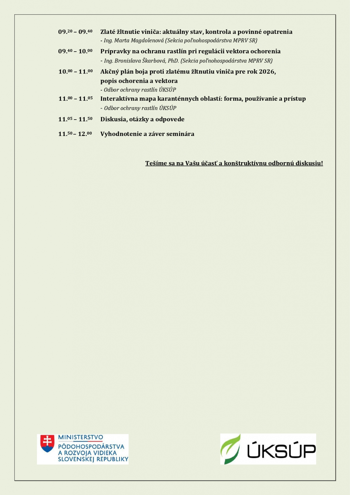 Dovoľujeme si Vás pozvať na informačný a vzdelávací seminár „Akčný plán a koordinovaný postup v boji proti zlatému žltnutiu viniča“, ktorý organizuje Ministerstvo pôdohospodárstva a rozvoja vidieka SR v spolupráci s Ústredným kontrolným a skúšobným ústavom poľnohospodárskym v Bratislave a Inštitútom znalostného pôdohospodárstva a inovácií.