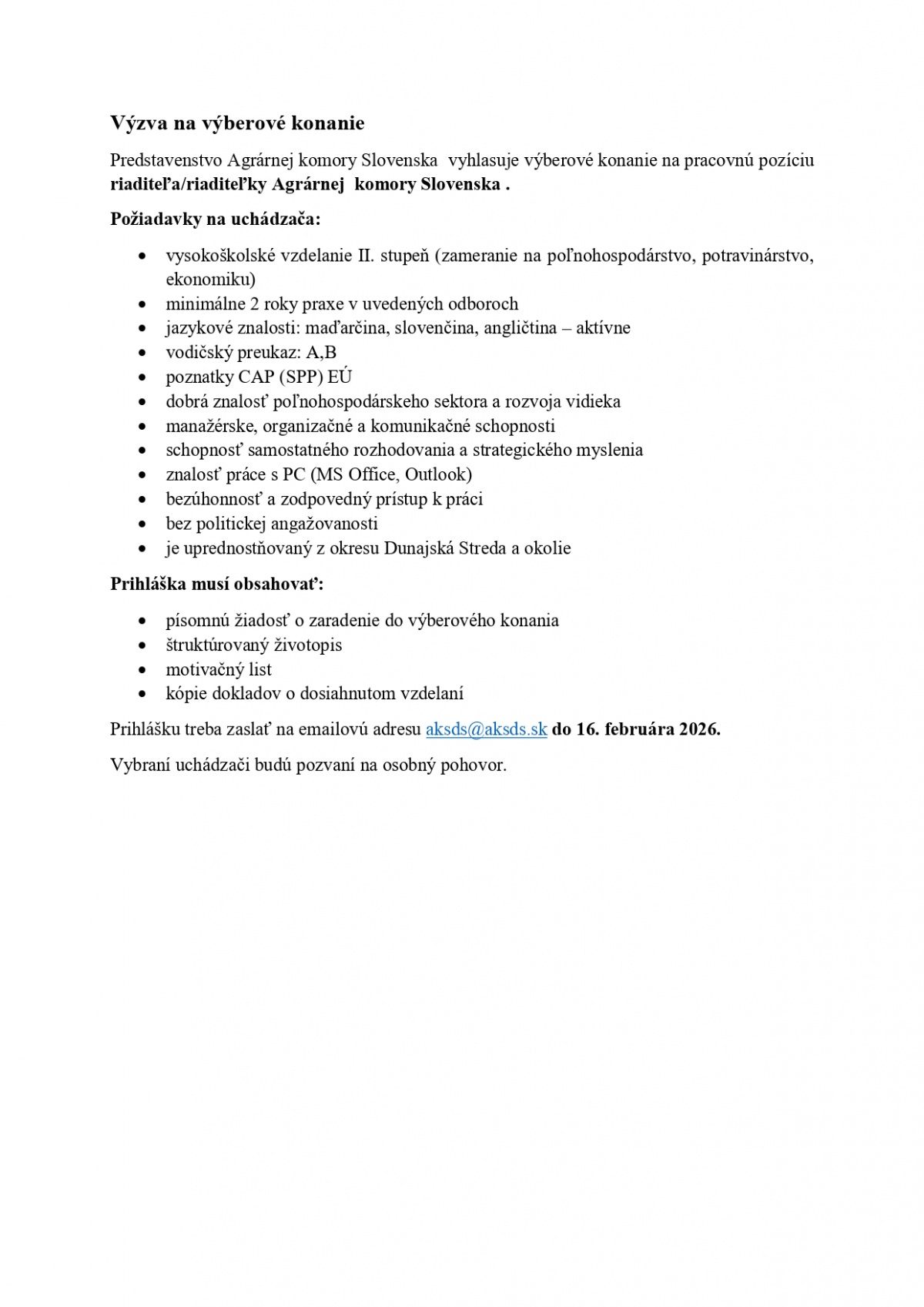 Predstavenstvo Agrárnej komory Slovenska vyhlasuje výberové konanie na pracovnú pozíciu riaditeľa/riaditeľky Agrárnej komory Slovenska .